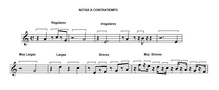 Notas a contratiempo Notas a contratiempo son las que se ejecutan en una parte o fracción débil del compás, llevan delante un silencio que se ejecuta en una parte o fracción fuerte o más fuerte que la nota a la que precede. Las notas a contratiempo pueden ser: Regulares: Notas a contratiempo en las que el silencio y la nota son de la misma duración. Irregulares: En ellas el silencio y la nota son de distinta duración, si el silencio dura más que la nota son por deficiencia y si el silencio dura menos que la nota son por ampliación. Segun su duración, pueden ser: Muy largas: Si el silencio más la nota duran más de dos partes. Largas: Si el silencio y la nota duran dos partes. Breves: Si entre el silencio y la nota duran dos medias partes. Muy breves: Si entre el silencio y la nota duran menos de dos medias partes. |