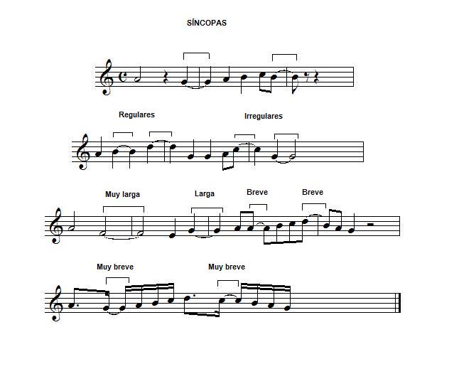 Síncopas Se llaman síncopas a las notas cuya primera mitad se ejecuta en una parte o fracción débil o menos acentuada que la segunda mitad. Las síncopas tienen como consecuencia que quedan más acentuadas las partes o fracciones débiles del compás que las fuertes. Las síncopas pueden ser: Regulares: cuando se pueden dividir en dos duraciones iguales. Irregulares: cuando no se pueden dividir en dos duraciones iguales. Además las sincopas irregulares pueden ser por deficiencia o por ampliación, dependiendo de si la percusión débil dura más que la fuerte o la percusión débil dura menos que la fuerte, respectivamente. Según su duración las síncopas pueden ser: Muy largas: si duran más de dos partes. Largas: si duran dos partes. Breves: si duran dos medias partes. Muy breves: si duran menos de dos medias partes. |